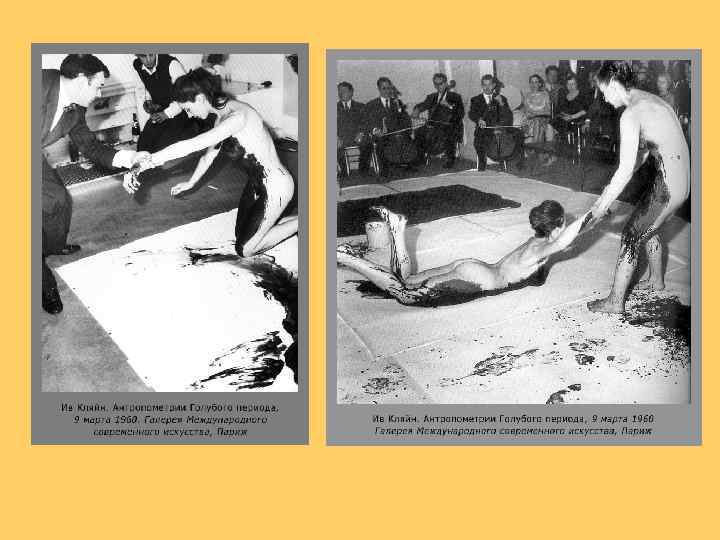 Хеппеннинг Художественные приемы и формы выражения • Смешивание различных театральных элементов и сочетание их с жизненными явлениями • отсутствие сюжета и каких либо логических связей между отдельными частями; может включать в себя несколько «событий» , разыгранных эпизодов, каждый из которых несет свою концепцию (идею). • Художниками движет стремление сломать традиционные установки и стереотипы (зритель картина), стереть границы между искусством и действительностью. • хэппенинги зачастую носят парадоксальный, даже абсурдный характер, являя собой абсолютно алогичное действие, в котором отсутствуют привычные в реальности связи и последовательности; • пространство свободы, игровое поле, где каждый участник может освободить свое запрограммированное сознание.
