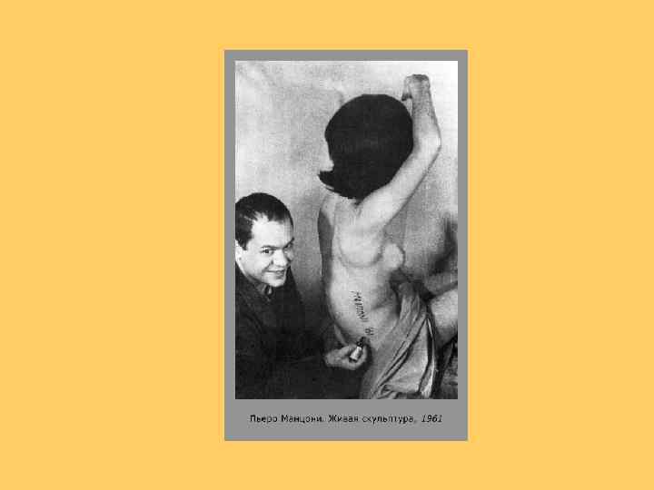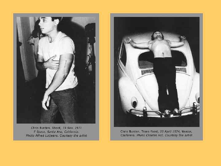 Боди арт Принципы и средства выражения: • Тело рассматривается как вещь для манипулирования • Повышенный интерес к пограничным экзистенциальным ситуациям: жизнь смерть, Эрос Танатос, садомазохистским мотивам, фрейдистской символике, сексуальной самоидентификация. • Сближается с панк культурой 1970 х гг. (с ее проблемами агрессии и саморазрушения), татуирование и раскрашивание тел, увлечение нудизмом; • Композиции создаются по принципу живых картин, которые разыгрываются прямо перед зрителями или записываются на фото и кинопленку и демонстрируются в выставочных залах. • Обращение к зачастую болезненным манипуляциям: исследование реакций своего организма (многочасовые изнурительные дыхательные упражнения, сжигание на себе волос); всевозможные ракурсы телесности, такие, как гримаса, укус, порез, погружение в ванну со льдом, демонстрируя результаты опытов публике. • игровое начало, импровизационность.