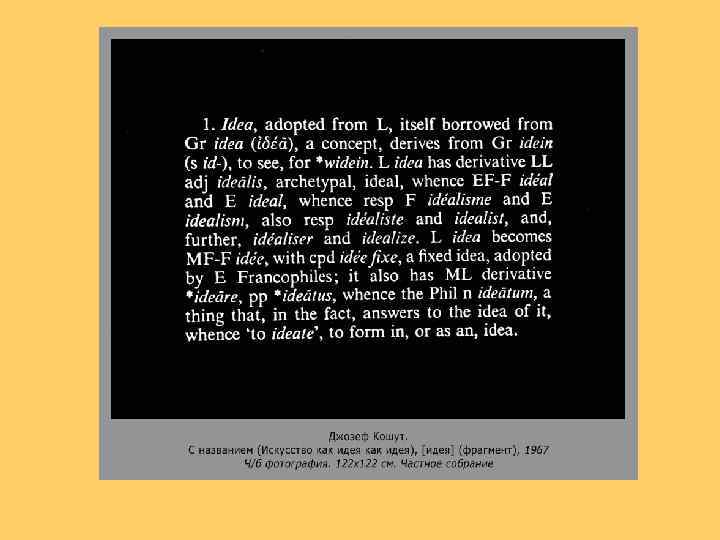 Авангард Концептуальное искусство – (от лат. conseptus мысль, представление), концептуализм литературно художественное направление постмодернизма, оформившееся в конце 1960 начале 1970 х гг. в американской, а затем и в европейской культуре. Цель искусства передать определенную идею, но не с помощью традиционных художественных форм и методов, а в ее непосредственном документально зафиксированном представлении. Основоположник - американский художник Джозеф Кошут. Представители – Терри Эткинсон, Йозеф Бойс, Майкл Болдуин, Дуглас Хюблер, Роберт Барри, Денис Оппенхейм, Сол Левит