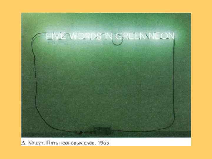 Концептуализм Принципы и средства выражения: - Исходит из положения, что концепция произведения важнее его физического выражения; - Концептуальные объекты существуют в виде набросков, коротких фраз, пространных текстов, схем, графиков, чертежей, фотографиях, киносъемках, аудио и видеозаписях, ксерокопиях, печатных и рукописных текстах, нередко используются и природные материалы (земля, трава, пепел). - Концептуальные композиции представляют собой чистый художественный жест, освобожденный от какой либо конкретной пластической формы: это могут и неоновые надписи, отрывки текстов из священных писаний и технических инструкций, обернутые в пластиковые мешки предметы мебели и т. д. - Искусство обращено не к эмоциональному сопереживанию, а ориентировано на угадывание идеи, интеллектуального осмысления увиденного.