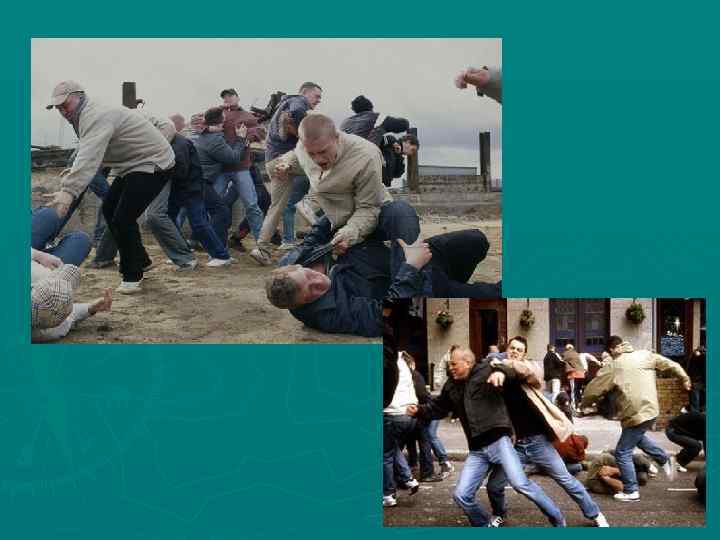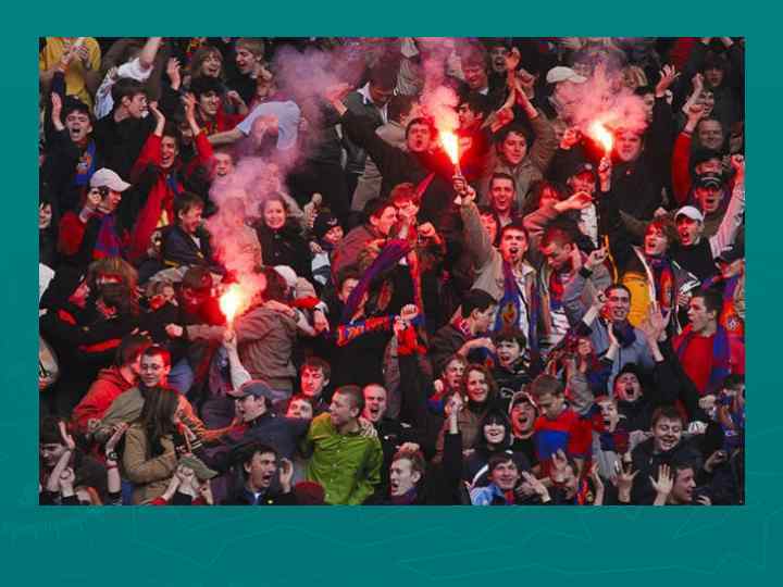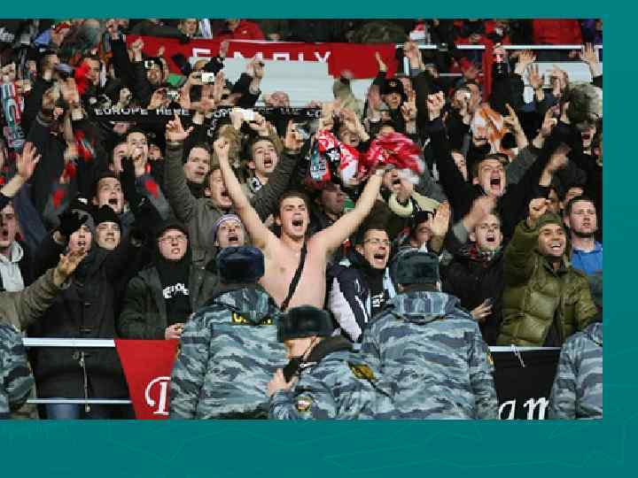 Футбол ► ► ► ► 9 июня 2002 г. после футбольного матча Россия – Япония на Манежной площади в Москве совершены массовые беспорядки, в результате чего зарегистрировано более 50 пострадавших, один погибший, 7 сожженных и 106 поврежденных иным способом автомобилей с материальным ущербом свыше 15 млн. рублей. В октябре 2003 г. в Москве фанатами «Спартака» и ЦСКА организовано кровавое побоище В марте 2005 г. после матча первого дивизиона между командами «Анжи» (Махачкала) и «Динамо» (Махачкала) произошла массовая драка между футболистами и болельщиками обеих команд • В 2005 г. в Санкт-Петербурге в день открытия чемпионата страны в масштабной драке между фанатами «Зенита» и «Динамо» применено холодное оружие, в результате чего девять человек получили ножевые ранения • В 2008 г. по существу каждый месяц чемпионата России по футболу омрачался стычками среди фанатов, ножевыми и огнестрельными ранениями • В отношении болельщиков «Зенита» по итогам матча 10 -го тура «Амкар» - «Зенит» в 2010 г. в Перми возбуждено два уголовных дела по статье 318 и статье 213 УК РФ • 1 ноября 2010 г. по факту смерти болельщика ЦСКА А. Архипова в Раменском Московской области возбуждено уголовное дело по статье 111 УК РФ • В декабре 2010 в Москве и Санкт-Петербурге начались акции хулиганств, массовых беспорядков, погромы футбольных фанатов из-за смерти в драке «спартаковского» фаната Е. Свиридова. На момент окончания настоящей работы указанные события еще не закончились. К фанатам примкнули националисты и члены экстремистских организаций, число задержанных насчитывается в несколько тысяч человек