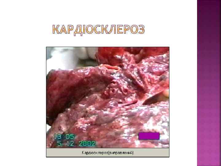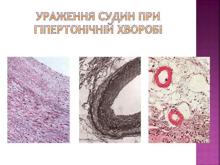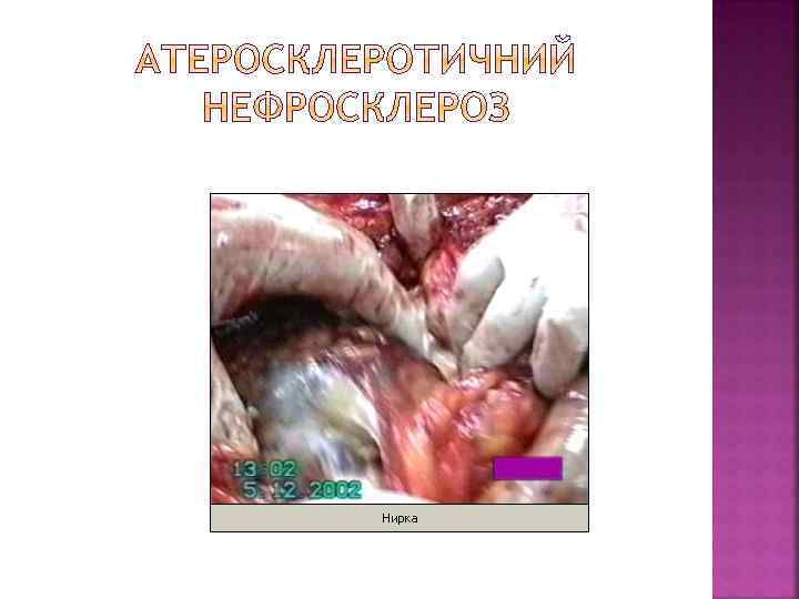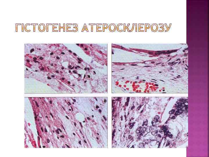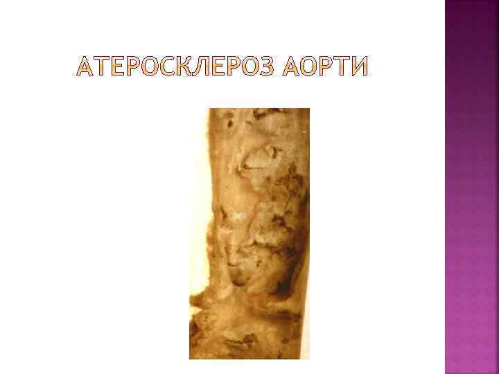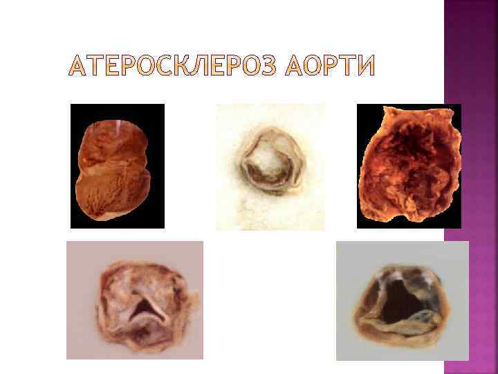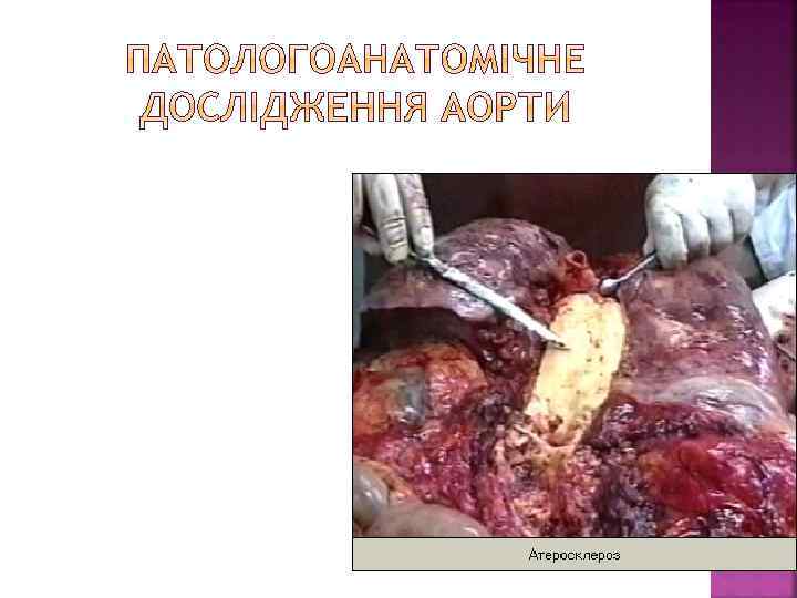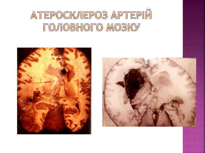 Клініко-морфологічні форми Клініко-морфологічні прояви Гострі Хронічні Атеросклероз аорти Відшарування середньої оболонки від інтими або адвентиції (розшаровуюча аневризма). Розрив і кровотеча. Тромбоз. Тромбоемболія з розвитком інфарктів і гангрени Атрофія грудини і тіл хребців від тиснення при наявності аневризми (мишковидна, циліндрична, веретеноподібна) Атеросклероз вінцевих артерій серця Гостра ішемічна хвороба серця (стенокардія, інфаркт міокарда) Хронічна ішемічна хвороба серця (кардіосклероз, хронічна аневризма серця) Атеросклероз артерій головного мозку Гематома, геморагічне просякання, інфаркти головного мозку Транзиторна ішемія – атрофія мозку, недоумкуватість, кісти Атеросклероз ниркових артерій Інфаркти нирок Атеросклеротичний Нефросклероз Атеросклероз кишки Абдомінальна ангіна, гангрена, перитоніт Атрофія слизової кишки Гангрена Атрофія м’язів, кульгавість артерій Атеросклероз артерій нижніх кінцівок переміжна