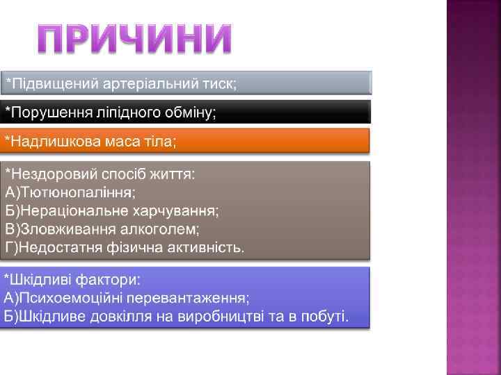 1. 2. 3. 4. 5. 6. Раптова коронарна смерть. Стенокардія Інфаркт міокарда Постінфарктний кардіосклероз Порушення серцевого ритму Серцева недостатність