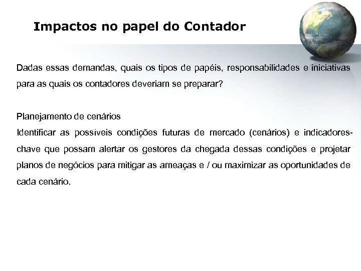 Impactos no papel do Contador Dadas essas demandas, quais os tipos de papéis, responsabilidades e iniciativas para as quais os contadores deveriam se preparar? Planejamento de cenários Identificar as possíveis condições futuras de mercado (cenários) e indicadoreschave que possam alertar os gestores da chegada dessas condições e projetar planos de negócios para mitigar as ameaças e / ou maximizar as oportunidades de cada cenário.