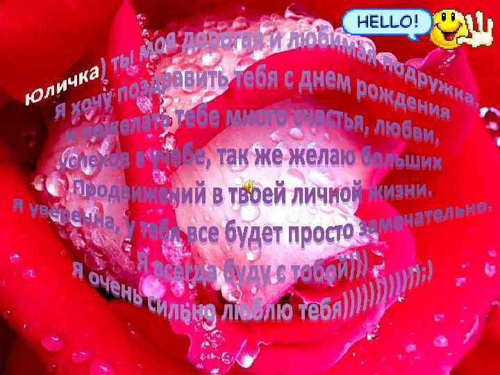 Ты моя дорогая подружка! Сколько вместе мы прожили дней. Мы с тобою делились друг с дружкой, И любовью, и горем, всем-всем. Я хочу пожелать тебе Юля. Чтоб такою всегда ты была. Чтоб смеялась ты громко и звонко, И алкашкою, чтоб не была. Только седня ведь день очень знатный. Так что выпьем сегодня с тобой. Оторвемся с тобою мы классно. Поболтаем опять обо всем. Та становишься очень прекрасной, Юной девушкой с каждым годком.