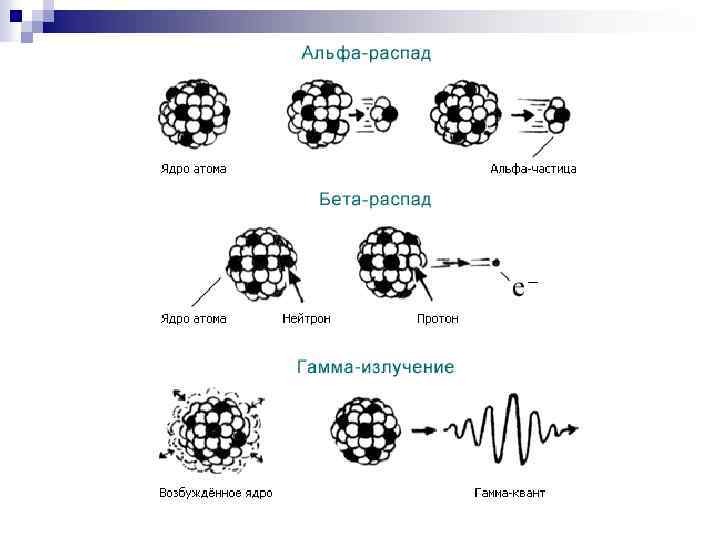 Естественная радиоактивность Самопроизвольный распад неустойчивых атомных ядер, спонтанно превращающихся в ядра других элементов и сопровождающийся испусканием альфа , бета частиц, гамма квантов и другими процессами, называется естественной радиоактивностью.