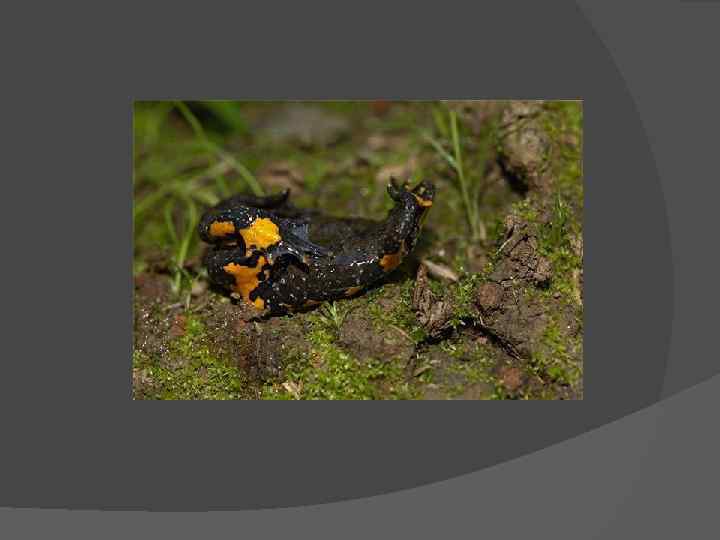 Краснобрюхая жерлянка (Bombina bombina) Названия: краснобрюхая жерлянка, обыкновенная жерлянка, европейская жерлянка. Ареал: Центральная и Восточная Европа, Турция, Германия, Чешская республика, Румыния, Словения, Австрия, Югославия, Швеция. Окрас: верх бурого цвета, с темными или грязно-зелеными пятнами, с бугорками. Низ оранжевый или красный с сине-черными пятнами и разводами. Рисунок пятен на животе индивидуален. Размер: 3, 5 -6 см. Среда обитания: равнины (степи, широколиственные и смешанные леса европейской части России), избегает гор. Обитает краснобрюхая жерлянка в воде (болота, озера, старицы, канавы, лужи речных пойм, рисовые поля). Предпочитает мелкие, хорошо прогреваемые водоемы, покрытые ряской, с глинистым дном. Не любит песчаный берег и быстрое течение. В солоноватых озерах отсутствует.