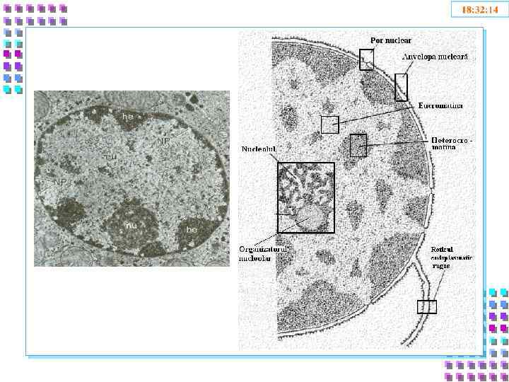Ядро • Ядерная оболочка: • • • Внешняя ядерная мембрана Внутренняя ядерная мембрана Перинуклеарное пространство Ядерная ламина Поровый комплекс • Кариоплазма • Лабильная фаза • Ядерный скелет • Хроматин • Эухроматин • Гетерохроматин • Ядрышки