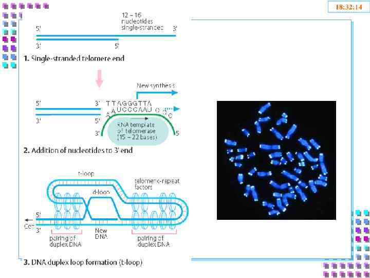 Теломера • Последовательности богатая G/C (у H. sapiens - TTAGGG) длиной 3 -20 kb • Образует петли на концах хромосом (TFR 1, TFR 2) • Предотвращает укорачивание хромосом как следствие репликации • Предотвращает соединение хромосом (индивидуализация хромосом) • Обеспечивает защиту хромосом