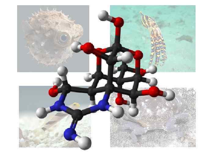 Тетродотоксин • содержится в рыбе фугу, (особенно в печени и в икре), в ряде бычковых рыб, в cинекольчатом осьминоге и других животных. • в микродозах оказывает аналгезирующий эффект • есть данные об использовании в качестве обезболивающего • первое описанное отравление в команде Джеймса Кука