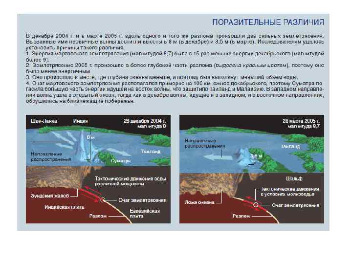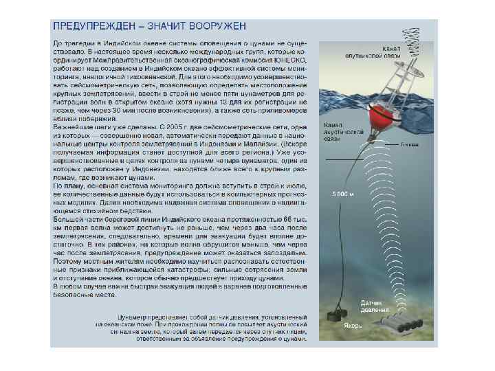 ЧТО ДЕЛАТЬ В СЛУЧАЕ ЦУНАМИ? Ни в коем случае не следует идти на берег, чтобы "посмотреть на волну цунами". Вы не сможете спастись, если волна действительно окажется рядом. Цунами - это не одна волна, а серия волн. Не возвращайтесь в опасные районы до тех пор, пока не дадут сигнал отбоя. Иногда приходу волн цунами предшествует заметное повышение или понижение уровня моря. В одном месте на побережье волна цунами может быть небольшой, но уже через несколько километров дальше по берегу она может быть очень большой. Никогда нельзя успокаиваться, видя небольшую высоту одной волны; за ней может последовать очень высокая волна.