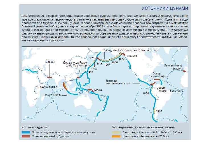 Волны цунами -это длинные морские волны, которые возникают вследствие землетрясений (90% случаев), деятельности вулканов и мощных подводных взрывов. Цунами возникают лишь после тех землетрясений, которые связаны с быстрым образованием на дне океана сбросов, обвалов, оползней.