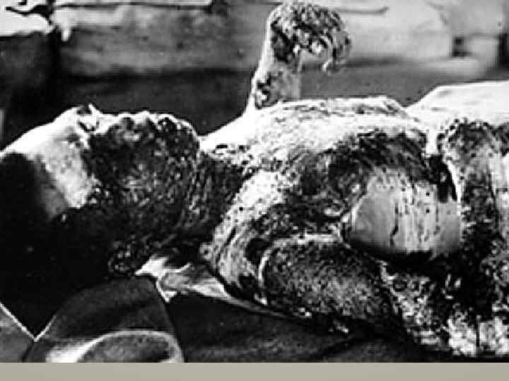 Атомные бомбардировки Хиросимы и Нагасаки Сумитэру Танигути (род. 1929) после бомбардировки Нагасаки (из воспоминаний Танигути): «Меня сбило на землю (с велосипеда), и какое-то время земля содрогалась. Я цеплялся за неё, чтобы не быть унесённым взрывной волной. Когда я взглянул вверх, дом, который я только что проехал, оказался разрушен… Я также видел, как ребёнка унесло взрывной волной. Большие камни летали в воздухе, один ударился об меня и затем снова улетел вверх в небо… Когда, казалось, всё улеглось, я попытался подняться и обнаружил, что на моей левой руке кожа, от плеча и до кончиков пальцев, свисает, как изодранные лохмотья»