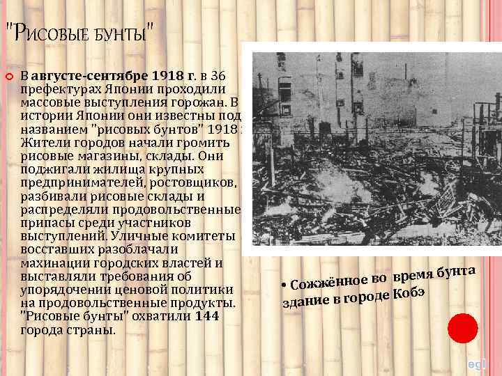 "РИСОВЫЕ БУНТЫ" В августе-сентябре 1918 г. в 36 префектурах Японии проходили массовые выступления горожан. В истории Японии они известны под названием "рисовых бунтов" 1918 г. Жители городов начали громить рисовые магазины, склады. Они поджигали жилища крупных предпринимателей, ростовщиков, разбивали рисовые склады и распределяли продовольственные припасы среди участников выступлений. Уличные комитеты восставших разоблачали махинации городских властей и выставляли требования об упорядочении ценовой политики на продовольственные продукты. "Рисовые бунты" охватили 144 города страны. унта е во время б • Сожжённо Кобэ ние в городе зда