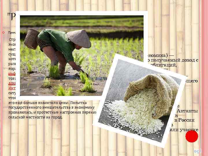 "РИСОВЫЕ БУНТЫ" Причины Стремительный рост цен на рис привёл к осложнению экономической ситуации, в частности, в сельской местности, где рис являлся основным средством существования. Фермеры, сравнивая низкие цены, по которым у них скупало рис государство с высокими рыночными, негодовали. Пик цен на рис совпал с витком поразившей страну после Первой мировой войны инфляции, повлиявшей на стоимость большинства товаров народного потребления и размер рентных доходов, что вызвало недовольство у горожан. Участие в Интервенции на сибирском фронте только усугубило ситуацию ― правительство начало скупать запасы риса, чтобы обеспечить провизией экспедиционный корпус, и это ещё больше взвинтило цены. Попытка государственного вмешательства в экономику провалилась, и протестные настроения перекинулись с сельской местности на город. Рента(экономика) — регулярно получаемый доход с капитала, облигаций, имущества, земли. Инфля ция (лат. Inflatio — вздутие) — повышение общего уровня цен на товары и услуги. Иностранная военная интервенция в России (1918− 1921) — военное вмешательство стран Антанты и Четвертного союза в Гражданскую войну в России (1917− 1922). Всего в интервенции приняли участие 14 государств.