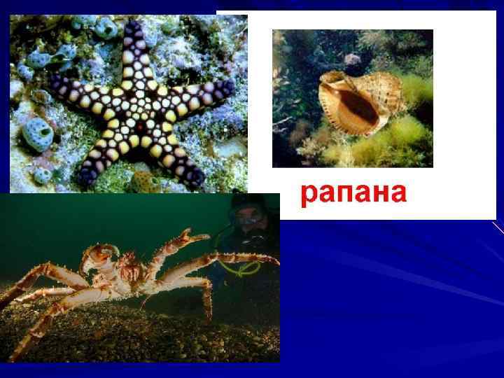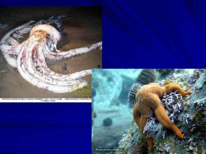 Флора и фауна У берегов Дальнего Востока происходит смешение тепловодной и умеренной фауны. Здесь можно встретить осьминогов и кальмаров — типичных представителей теплых морей. В то же время вертикальные стены, поросшие актиниями, сады из бурых водорослей — ламинарий, — все это напоминает пейзажи Белого и Баренцева моря. В Японском море огромное изобилие морских звезд и морских ежей, различной окраски и разных размеров, встречаются офиуры, креветки, небольшие крабы (камчатские крабы здесь встречаются только в мае, а затем они уходят дальше в море). На скалах и камнях живут ярко-красные асцидии. Из моллюсков наиболее распространены гребешки. Из рыб часто встречаются морские собачки, морские ерши.