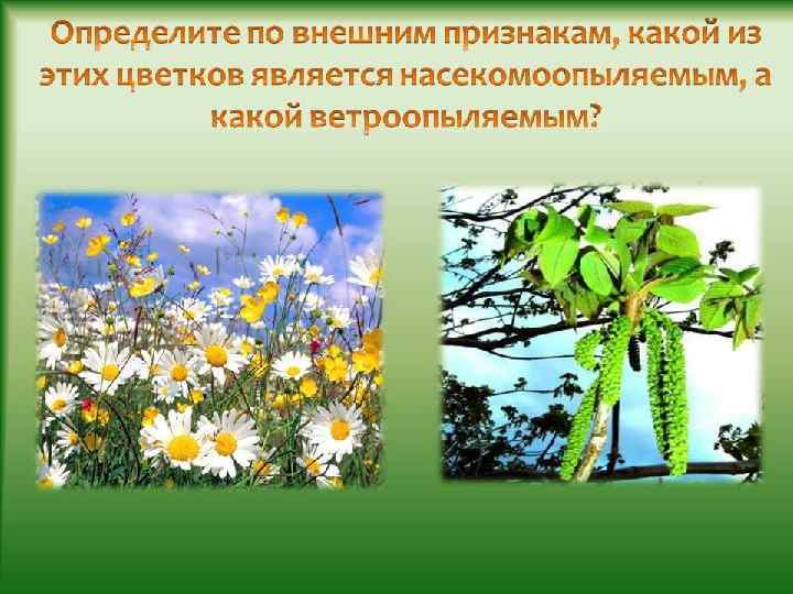 Насекомые Ветер насекомоопыляемые ветроопыляемые - крупные размеры цветка или наличие соцветия; - аромат; - нектар; - яркая окраска. - мелкие размеры цветков, собранных в соцветие; - много мелкой, сухой пыльцы; - раннее цветение; - скопление растений.