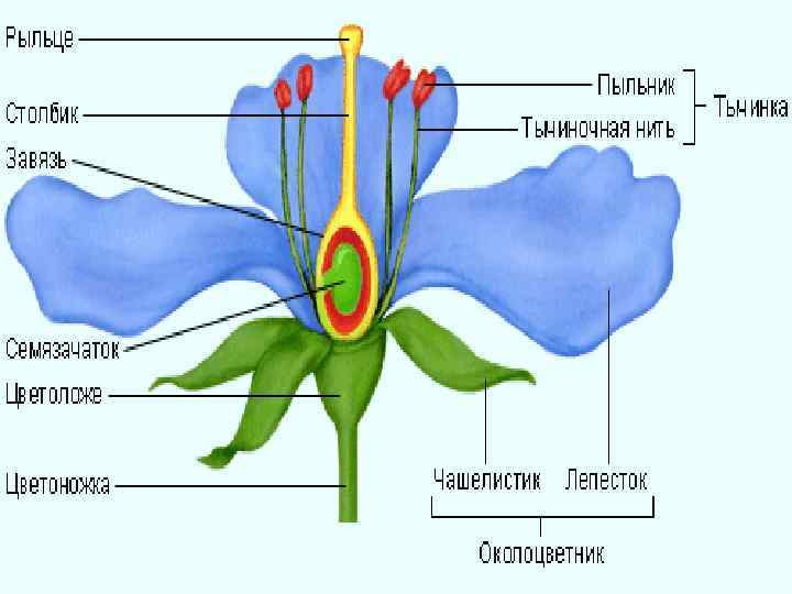 Цветок Главные части: Пестик: -рыльце -столбик -завязь Тычинки: -тычиночная нить -пыльник Околоцветник: Венчик - из лепестков, ярко окрашен Чашечка – из чашелистиков, зеленого цвета Цветоножка Цветоложе