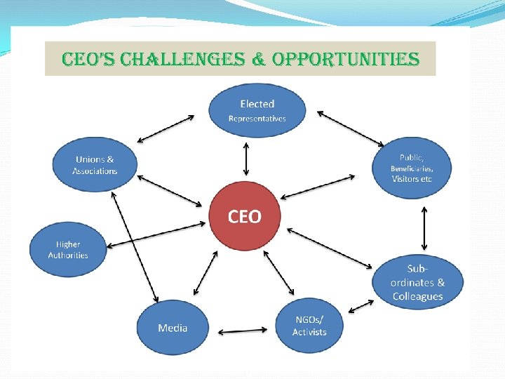 Time Management – for CEOs CEO has to perform following important activities : 1. Meetings- Statutory & Administrative meetings, 2. Discussion with Elected Representatives, 3. Visits to PS/PHC/VP & devt. Works 4. Inspections of VP, PS, PHC, VAC-VD, etc. 5. Attending visitors and grievance redressal 6. Disposal of files & taking decisions. 7. Appearance before judicial, Quasi-judicial & Legislature committees