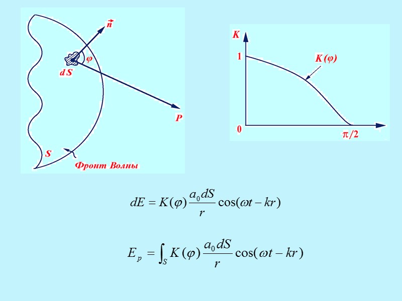 Согласно принципу Гюйгенса-Френеля: Все вторичные источники фронта волны, исходящей из одного источника, когерентны между собой. Для вторичных источников справедлив принцип суперпозиции. • Равные по площади участки волновой поверхности излучают равные интенсивности. Амплитуда вторичных волн в направлении, составляющем угол φ с нормалью, тем меньше, чем больше угол φ
