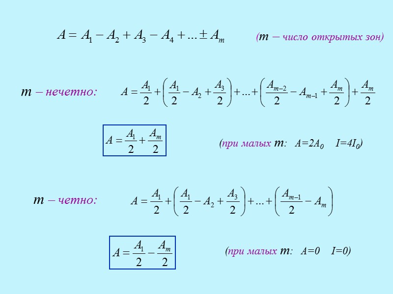 m – нечетно: m – четно: (при малых m: А=2А0 I=4I0) (при малых m: А=0 I=0) (m – число открытых зон)