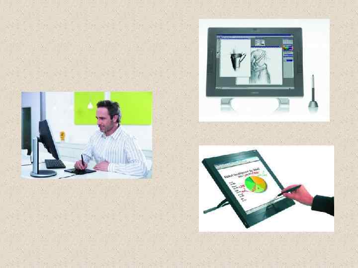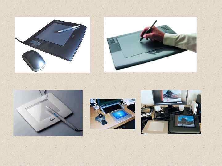 – аппаратное средство для создания чертежей и рисунков специальный планшет (непрозрачный / с подсветкой) круговой курсор (для ввода чертежей) световое (компьютерное) перо (можно пользоваться как обычной пишущей ручкой ) Дигитайзер характеризуется: Ш размером рабочей площади планшета Ш разрешающей способностью (до 2540 линий на дюйм) Ш типом светового пера Ш интерфейсом подключения (COM-порт или USB) Ш др. и