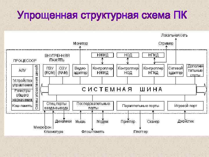 системный блок монитор характеризуется: конструкцией корпуса мощностью блока питания системой вентиляции количеством «посадочных мест» клавиатура мышь периферийные устройства принтер, сканер, дигитайзер и др. Материнская (системная) плата несет на себе главные компоненты ПК. К ней подключаются все устройства, входящие в системный блок. Функции материнской платы – связь и координация действий всех устройств ПК, передача сигнала от одного устройства к другому с помощью системной шины.