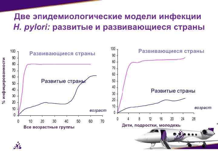 Эпидемиология H. pylori • Инфицирование H. pylori происходит у большинства больных в детском или подростковом возрасте • Механизм передачи H. pylori – фекально-оральный и орально-оральный • Факторы риска инфицирования H. Pylori: низкий социально-экономический уровень, скученность людей (большие коллективы), плохие санитарные условия • H. Pylori живёт внутри СОЖ или непосредственно над ней (по слоем слизи), а также в местах эктопированного желудочного эпителия – «метаплазии» (в пищеводе, ДПК, тонкой и прямой кишке)