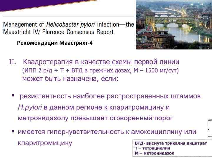 • Рекомендации Маастрихт-4 предполагают общую стратегию, получившую название test and treat ( «обследуй и лечи» ) • У пациентов с неуточненной диспепсией, лиц с симптомами «тревожности» или пожилого возраста более приемлемой является стратегия endoscopy and treat ( «проведи эндоскопию и лечи» )
