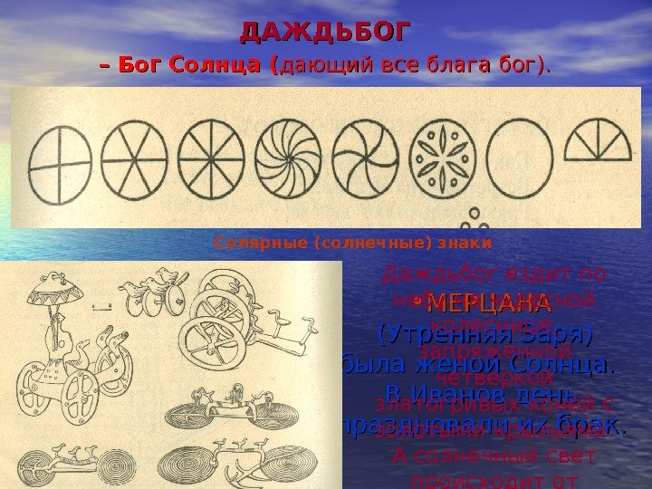 Солярные (солнечные) знаки ДАЖДЬБОГ – – Бог Солнца ( дающий все блага бог). • Священным знаком Солнца был крест • МЕРЦАНА (Утренняя Заря) была женой Солнца. В Иванов день праздновали их брак. Даждьбог ездит по небу на чудесной колеснице, запряженной четверкой златогривых коней с золотыми крыльями. А солнечный свет происходит от золотого щита.