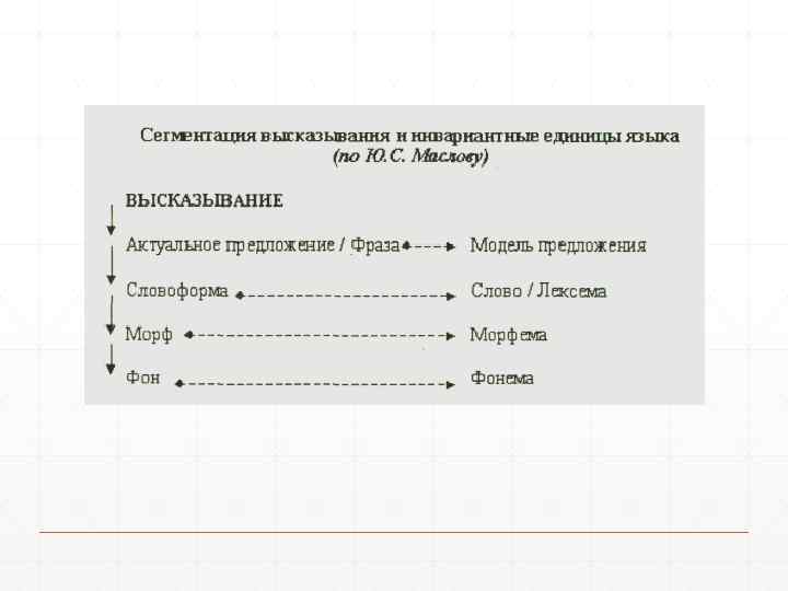 Модель представления языка можно назвать уровневой. Уровни – это части языка, подсистемы общей языковой системы. Сегментация Интеграция Синтаксический ярус Предложение Лексический ярус Лексема Морфемный (морфологич. ) ярус МОРФЕМА Фонологический ярус ФОНЕМА Каждый уровень (ярус) характеризуется совокупностью однородных единиц и набором правил, регулирующих их использование. Таким образом, фонетический (фонемный) уровень – это упорядоченное множество фонем; лексический – упорядоченное множество лексем и т. д.