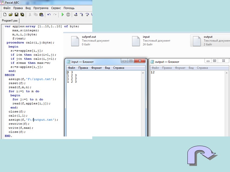 План прямоугольного сада размером mxn состоит из квадратных зон. В каждой зоне растёт по дереву. С каждого дерева любой зоны могут упасть несколько яблок. В левом верхнем квадратике находится ёжик, который должен дойти до правого нижнего квадратика. В саду существуют ограничения относительно способа передвижения: ёжик может двигаться из текущего квадратика только в один из двух соседних правый либо нижний. Составьте программу, которая вычисляет максимальное количество яблок, которое может собрать ёжик, передвигаясь к нужному квадратику. Технические условия: План сада задан таблицей apples содержащей m строк и n столбиков. Элемент apples[i,j] таблицы указывает количество яблок, упавших с дерева в зону с координатами i,j. Текстовый файл "input.txt" содержит в первой строке числа m,n разделённые пробелом. В каждой из следующих m строк содержится по n чисел apples[i,j] разделённых пробелами. Файл "output.txt" должен содержать одно натуральное число. Примеры входных и выходных файлов: Input.txt 3 3 1 2 3 1 2 3 1 2 3 Output.txt 12
