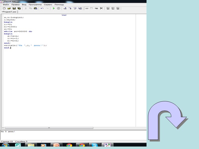 Условие: Хлестакова приглашали управлять департаментом. В первый день ему прислали 1000 курьеров, а в каждый следующий - в 2 раза больше, чем в предыдущий. Хлестаков согласился, когда прислали 30000 курьеров. На какой день это произошло? (Учесть, что Хлестаков слаб в умножении и делении).
