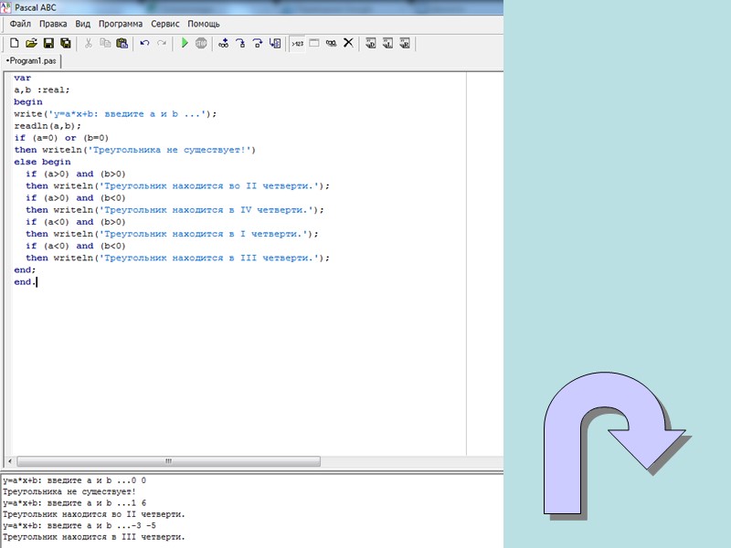 Условие: Вычислите, в какой координатной четверти расположен треугольник, образованный прямой, заданной уравнением y=ax+b, и осями координат. Решение: Если в уравнении прямой первый коэффициент положительный, то прямая лежит либо во второй, либо в четвертой четверти, при этом если свободный член положительный, то во второй, а если отрицательный- то в четвертой. Значит там же находится и весь треугольник, так как он образован этой прямой и осями координат. Аналогично рассуждаем и для отрицательного углового коэффициента: при положительном свободном члене - первая четверть, а при отрицательном - третья.