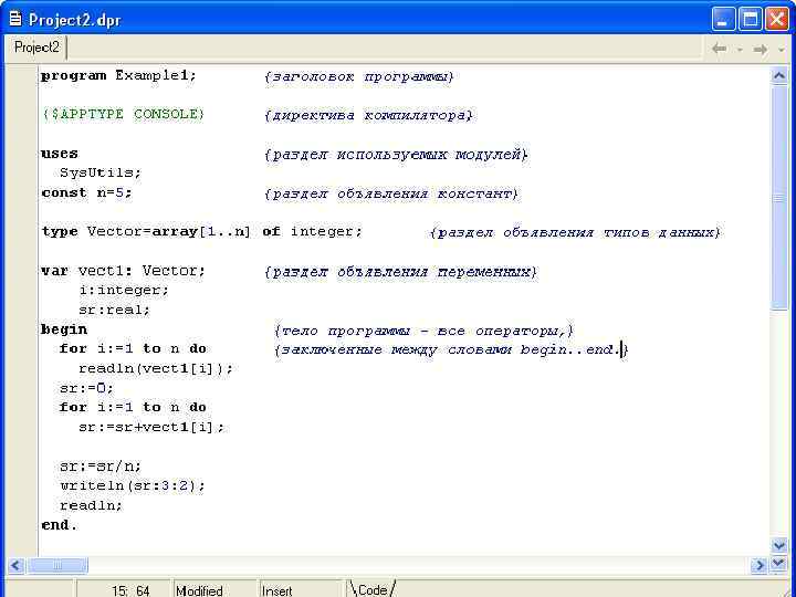 ¡ ¡ ¡ Любой используемый раздел начинается с соответствующего зарезервированного слова. В языке Паскаль следующие друг за другом предложения отделяются точкой с запятой. Заголовок программы состоит из зарезервированного слова program и имени программы. Завершается заголовок точкой с запятой, например: program Example 1; Заголовок программы является необязательным элементом и игнорируется компилятором.