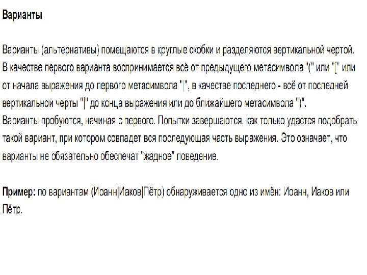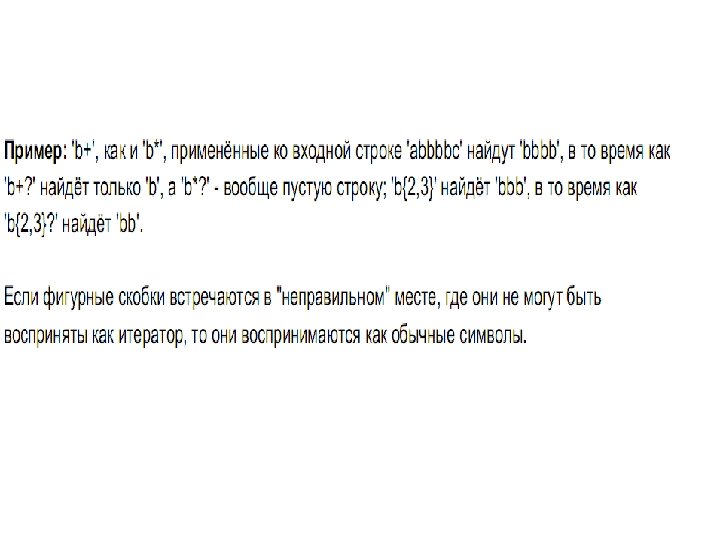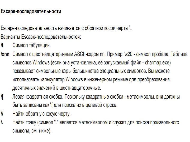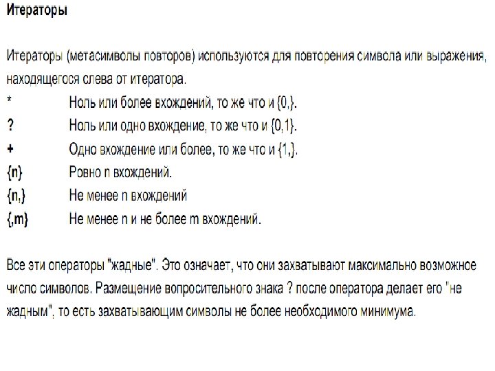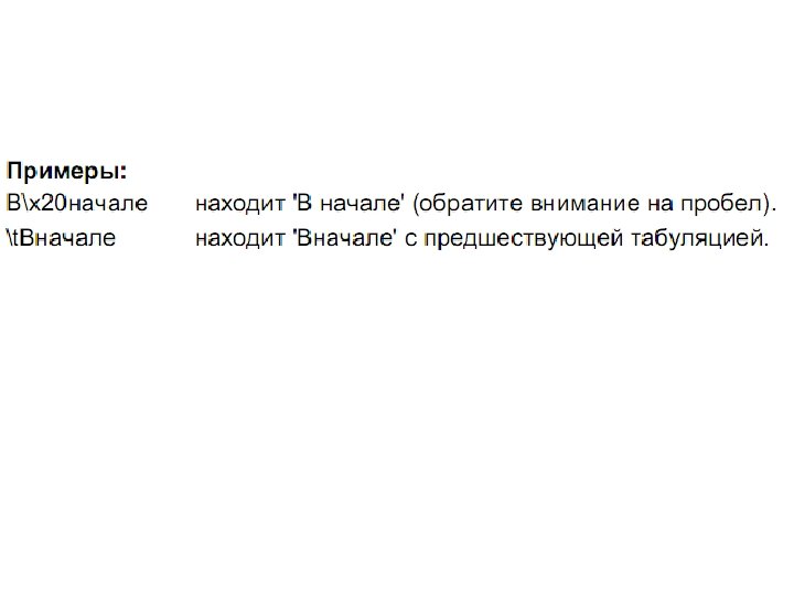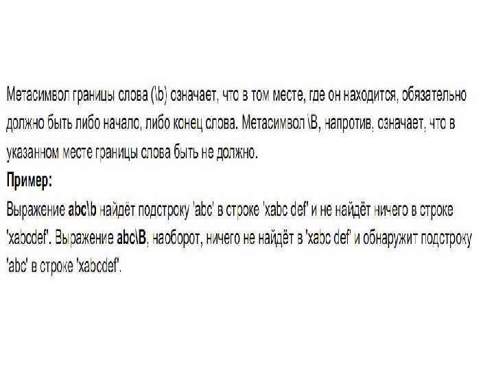 Метасимволы- сокращения w Слово. То же, что и [a-z. A-Z а-я. А-Я_0 -9] W Все, кроме слов. То же, что и [^a-z. A-Z_09]. s Любое пустое место. То же, что и [ fnrtv]. S Любое непустое место. То же, что и [^ fnrtv]. d Десятичная цифра. То же, что и [0 -9]. D Не цифра. То же, что и [^0 -9]. .