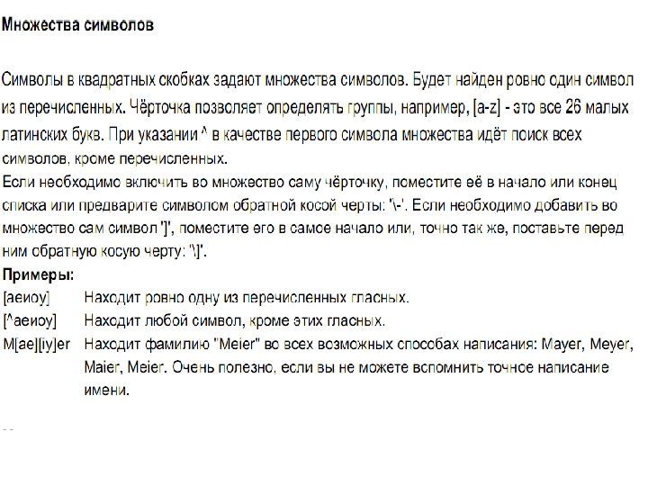 Регулярные выражения • состоят из обычных символов и специальных символов, так называемых метасимволов • метасимволы или их начальные части: • . ( ) [ ] { } ^ $ + * ? (кроме того, только в определении множеств символов: - ).