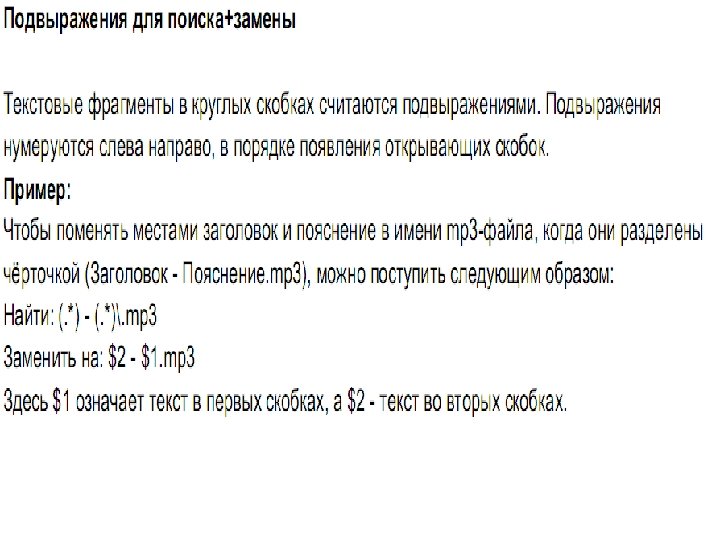 Обычные символы -означают сам себя, то есть в искомой строке должен находиться в точности этот символ и ничто иное. То же самое относится к нескольким обычным символам, идущим подряд. • Пример: тест находит строку "тест" в исследуемом тексте. Обратите внимание: "тест" при этом обнаруживается В ЛЮБОМ МЕСТЕ имени файла или текстовой строки.