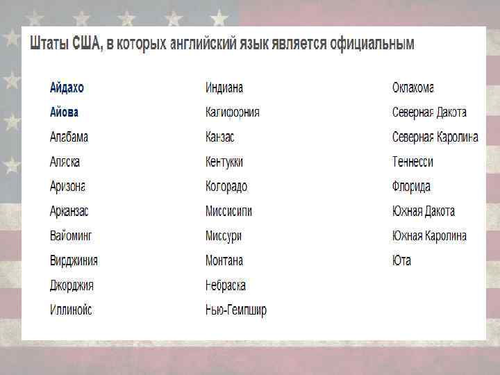 Языки, на которых говорят в США • Английский (до 2011 г. не являлся официальным на федеральном уровне) • Испанский (Техас, Калифорния, Нью-Мексико) • Французский (Луизиана и Мэйн) • Немецкий (Северная и Южная Дакота) • Славянские языки (Иллинойс, Нью Йорк, Нью Джерси, Коннектикут) • Китайский (Калифорния, Нью Йорк, Гавайи, Массачусетс) • Корейский (Гавайи, Калифорния, Нью Джерси)