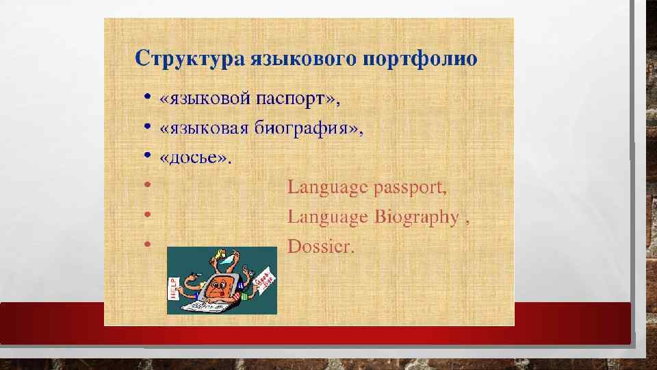 «ЯЗЫКОВОЙ ПАСПОРТ» -ЯЗЫКОВЫЕ УМЕНИЯ В СООТВЕТСТВИИ С ЕВРОПЕЙСКИМИ КОМПЕТЕНЦИЯМИ ВЛАДЕНИЯ ИЯ; СВЕДЕНИЯ ОБ ИЗУЧЕНИИ ЯЗЫКОВ И ОПЫТЕ МЕЖКУЛЬТУРНОГО ОБЩЕНИЯ, ПЕРЕЧЕНЬ СЕРТИФИКАТОВ И ДИПЛОМОВ, СВИДЕТЕЛЬСТВУЮЩИХ О ПРОГРЕССЕ ОБУЧАЮЩИХСЯ В ИЗУЧЕНИИ ИЯ). В ЯЗЫКОВОЙ БИОГРАФИИУЧАЩИЙСЯ ОПРЕДЕЛЯЕТ СВОЙ УРОВЕНЬ ВЛАДЕНИЯ ИЗУЧАЕМЫМ ЯЗЫКОМ ПО ТАБЛИЦЕ САМООЦЕНКИ. ОН ВНИМАТЕЛЬНО ОСВАИВАЕТ ОПИСАНИЕ КОММУНИКАТИВНЫХ УМЕНИЙ В ЛИСТАХ САМООЦЕНКИ, ЗАТЕМ ОТМЕЧАЕТ ТЕ КОММУНИКАТИВНЫЕ УМЕНИЯ, КОТОРЫМИ ОН, ПО ЕГО МНЕНИЮ, УЖЕ ОВЛАДЕЛ, И ТЕ, КОТОРЫМИ ЕМУ ПРЕДСТОИТ ОВЛАДЕТЬ. УЧИТЕЛЬ ПОМОГАЕТ УЧАЩЕМУСЯ УВИДЕТЬ СВОИ ДОСТИЖЕНИЯ И НЕДОСТАТКИ И НАМЕТИТЬ ПУТЬ УСТРАНЕНИЯ ПОСЛЕДНИХ. В ДОСЬЕ УЧАЩИЙСЯ СОБИРАЕТ ВЕСЬ МАТЕРИАЛ, СВИДЕТЕЛЬСТВУЮЩИЙ О ЕГО УСПЕХАХ В ОВЛАДЕНИИ ЯЗЫКАМИ. ЭТО МОГУТ БЫТЬ РАБОТЫ, ВЫПОЛНЕННЫЕ ИМ САМОСТОЯТЕЛЬНО НА УРОКЕ (КОНТРОЛЬНЫЕ РАБОТЫ, ТЕСТЫ, СОЧИНЕНИЯ И Т. П. ), ДОМА, НА ВНЕКЛАССНЫХ ЗАНЯТИЯХ (ПРОЕКТЫ, РЕФЕРАТЫ, ДОКЛАДЫ, ДИПЛОМЫ), ПОДТВЕРЖДАЮЩИЕ ДОСТИЖЕНИЯ ПОЛЬЗОВАТЕЛЯ ПОРТФЕЛЯ В ИЗУЧЕНИИ ЯЗЫКА. ДОСЬЕ- ЛУЧШИЕ ТВОРЧЕСКИЕ РАБОТЫ; ОПИСАНИЕ ПРОЕКТОВ И ИССЛЕДОВАТЕЛЬСКИХ РАБОТ, ВЫПОЛНЕННЫХ УЧЕНИКОМ; СПИСОК ПРОЧИТАННОЙ ЛИТЕРАТУРЫ; СЛОВА ЛЮБИМЫХ ИНОСТРАННЫХ ПЕСЕН И Т. П.
