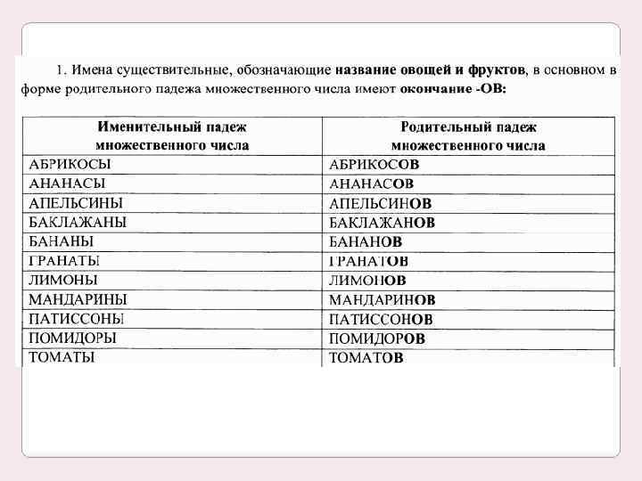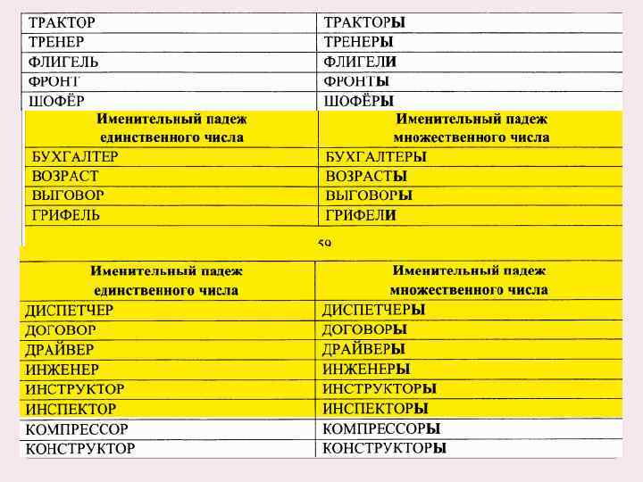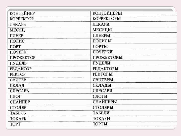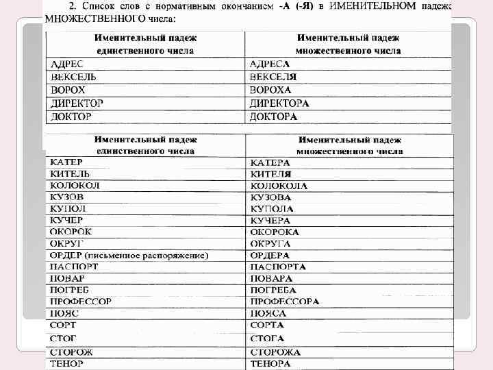1. В именительном падеже множественного числа существительные мужского рода могут иметь вариативные окончания -а (-я) и -ы (-и). При выборе окончания следует обратить внимание на то, что многие слова имеют нормативные устоявшиеся формы: - -а (-я) - сторожа, егеря, обшлага, тенора, буфера, желоба, окорока, терема, веера, жемчуга, округа, тетерева, века (но: во веки веков, в кои веки), жернова, ордера, закрома, паруса, флюгера, векселя, кивера, паспорта, холода, вензеля, перепела, хутора, вечера, колокола, повара, черепа, края, погреба, шелка, глаза, купола, поезда, штемпеля, голоса, адреса, края, бега, корма, купола; - -ы (-и) - конюхи, шофёры, заводы, аптекари, библиотекари, выборы, выпуски, консулы, переговоры, ректоры, торты, лидеры, снайперы. ТЕОРЕТИЧЕСКИЙ МИНИМУМ