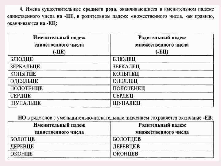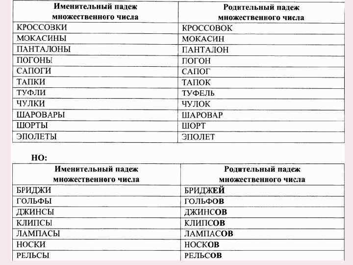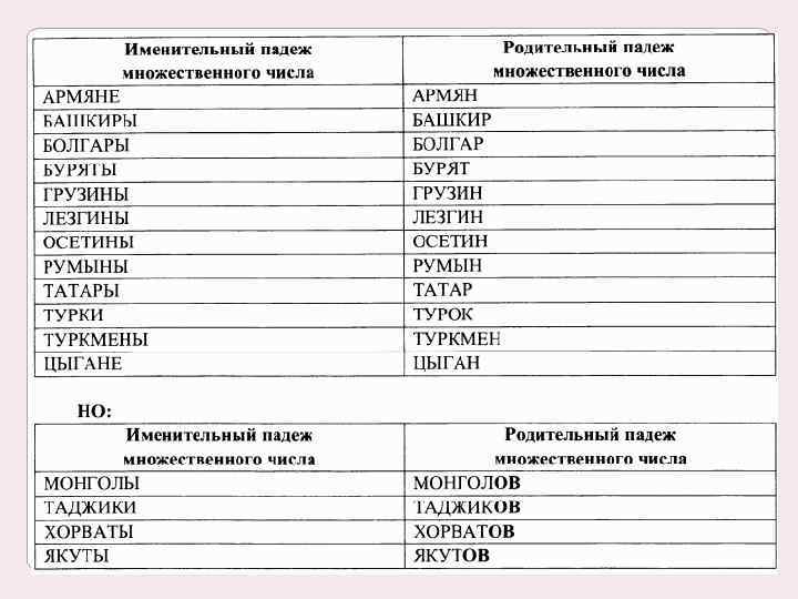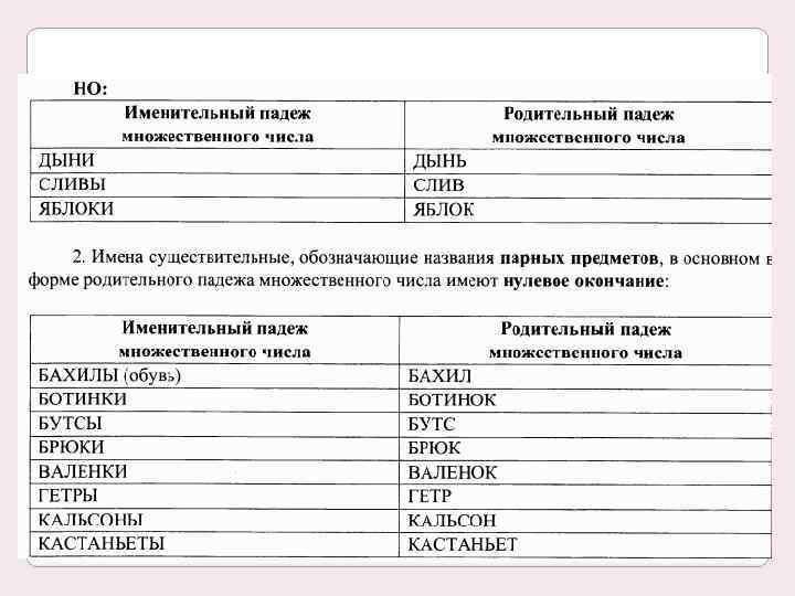 В родительном падеже множественного числа одни существительные мужского рода могут иметь нулевое окончание, другие - окончание -ов. с нулевым окончанием употребляются обычно следующие существительные: - названия парных предметов, а также предметов, состоящих из нескольких частей (ботинок, брюк, валенок, погон, чулок и др. ). НО: носков, гольфов, клипсов; - названия единиц измерения (ампер, киловатт, рентген, микрон); - - названия некоторых овощей, фруктов, плодов (яблок, маслин); - - названия национальностей. Как правило, это слова, основа которых оканчивается на -Н-, -р- (армян, башкир, грузин, осетин, туркмен, молдаван, цыган, болгар), а также - бурят, турок; - - названия лиц по принадлежности к воинским соединениям (солдат. партизан, гусар); - - существительные, употребляемые только во множественном числе: каникул, крестин, потемок, сумерек