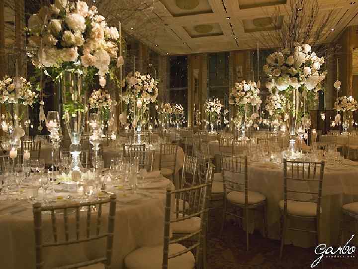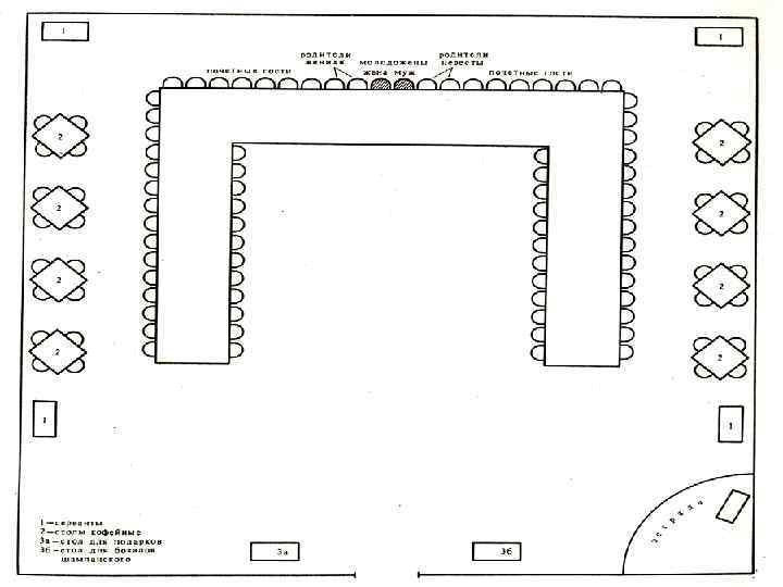 • В ресторанах для обслуживания свадебных торжеств выделяют специальное помещение. Лучше, когда их два: одно — для встречи и сбора гостей, а затем для танцев, другое — для банкетного стола. • При наличии одного зала стол ставят таким образом, чтобы в зале у входной двери оставалось место для сбора и танцев гостей.