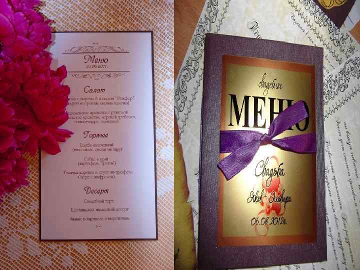 Свадебное меню Характерной особенностью меню является разнообразный ассортимент холодных закусок, солений, маринадов, напитков, кондитерских изделий, фруктов. Кроме холодных закусок и блюд, в меню включают одно, а иногда два горячих блюда. Время подачи горячих блюд заранее согласовывают с заказчиком.
