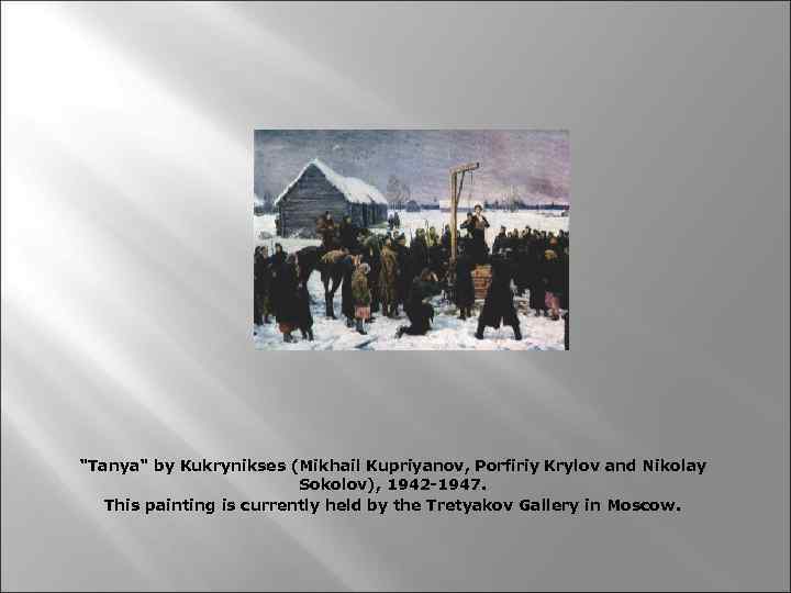 "Tanya" by Kukrynikses (Mikhail Kupriyanov, Porfiriy Krylov and Nikolay Sokolov), 1942 -1947. This painting is currently held by the Tretyakov Gallery in Moscow.