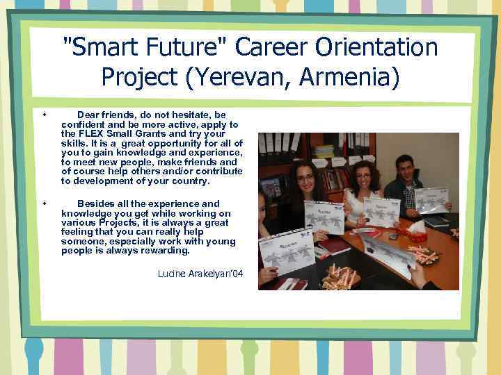 "Smart Future" Career Orientation Project (Yerevan, Armenia) • Dear friends, do not hesitate, be confident and be more active, apply to the FLEX Small Grants and try your skills. It is a great opportunity for all of you to gain knowledge and experience, to meet new people, make friends and of course help others and/or contribute to development of your country. • Besides all the experience and knowledge you get while working on various Projects, it is always a great feeling that you can really help someone, especially work with young people is always rewarding. Lucine Arakelyan’ 04