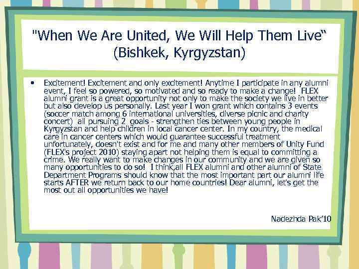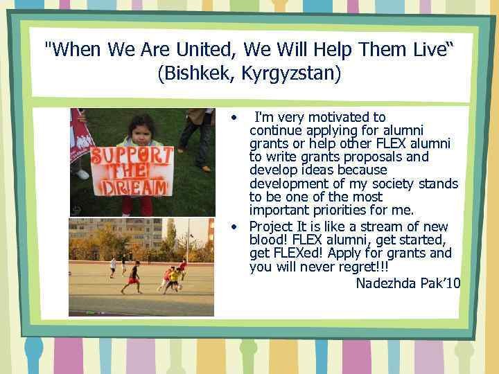 "When We Are United, We Will Help Them Live“ (Bishkek, Kyrgyzstan) • I'm very motivated to continue applying for alumni grants or help other FLEX alumni to write grants proposals and develop ideas because development of my society stands to be one of the most important priorities for me. • Project It is like a stream of new blood! FLEX alumni, get started, get FLEXed! Apply for grants and you will never regret!!! Nadezhda Pak’ 10
