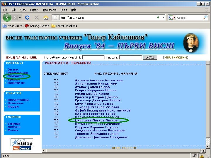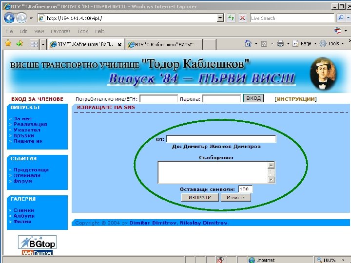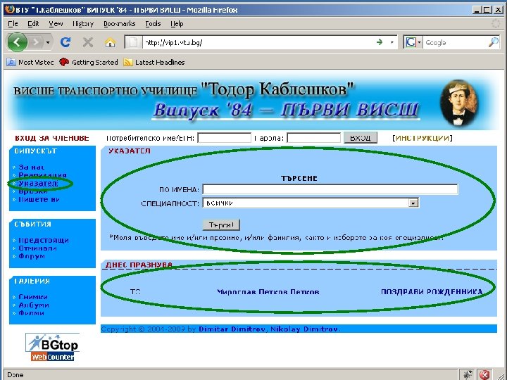 ЗА САЙТА НА ВИПУСКА http: //vip 1. vtu. bg/ 1. Вход в системата чрез ЕГН (потребителско име) и парола 2. Показва имената когато члена от випуска е разпознат