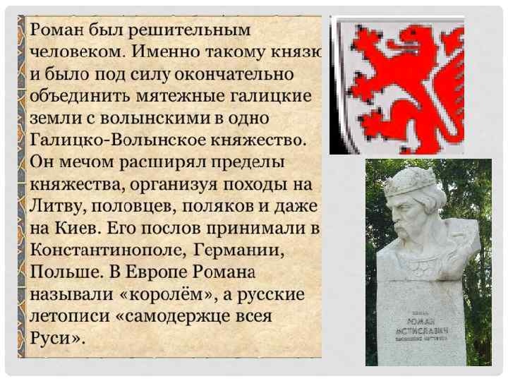 ГАЛИЦКО-ВОЛЫНСКОЕ КНЯЖЕСТВО Роман Мстиславич – князь волынский (1170 -1187, 1188 -1199) Пользуясь смутой после смерти Ярослава Осмомысла в 1187 г. , пытался захватить Галич. Но вмешательство Венгрии разрушило его планы. 1199 г. – смог объединить Галицкое и Волынские княжество в одно – Галицко-Волынское.