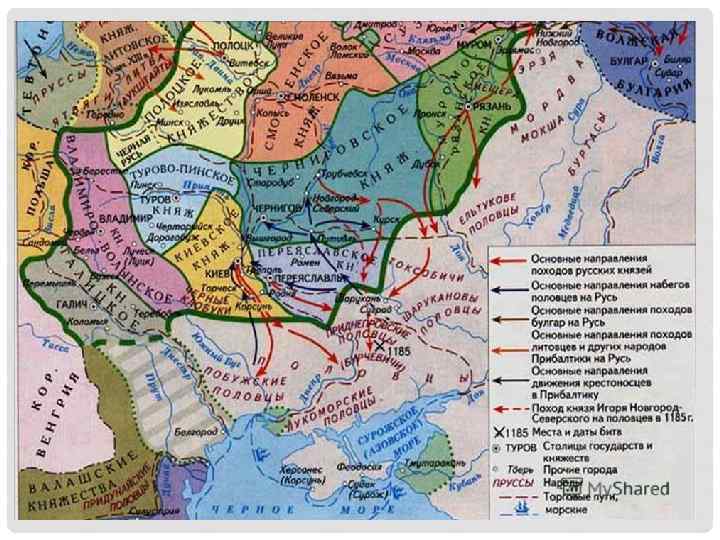 ПРИЧИНЫ ФЕОДАЛЬНОЙ РАЗДРОБЛЕННОСТИ • Постоянные набеги кочевников и постепенный отток населения на северо-восток Руси • Упадок торговли по Днепру вследствие половецкой опасности и утраты Византийской империи главенствующей роли в международной торговле • Рост городов как центров удельных земель • Порядок престолонаследия